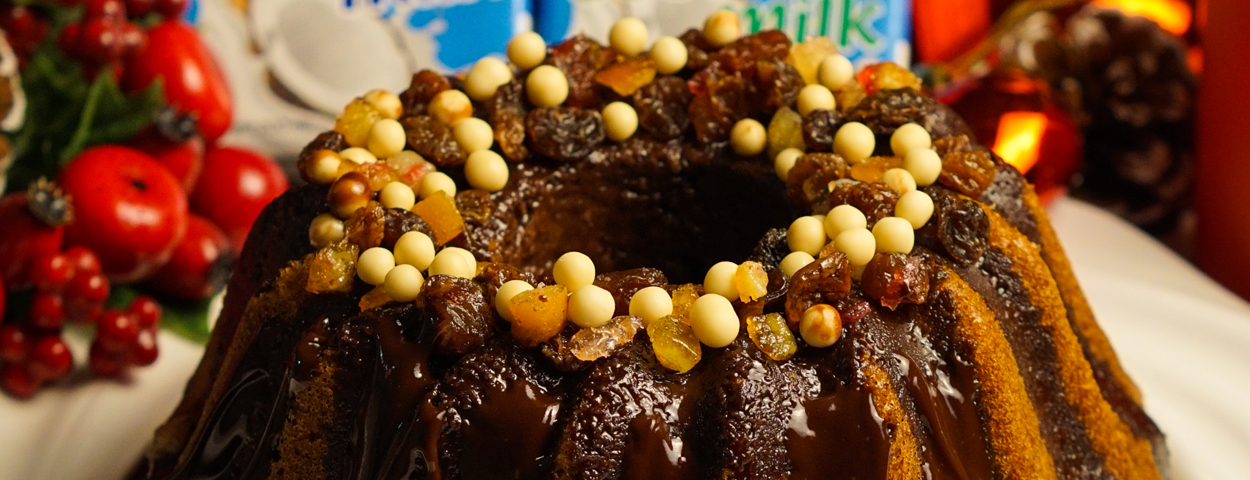 Drizzle dark chocolate ganache over the bundt cake. Garnish with dried fruits and white chocolate pearls.